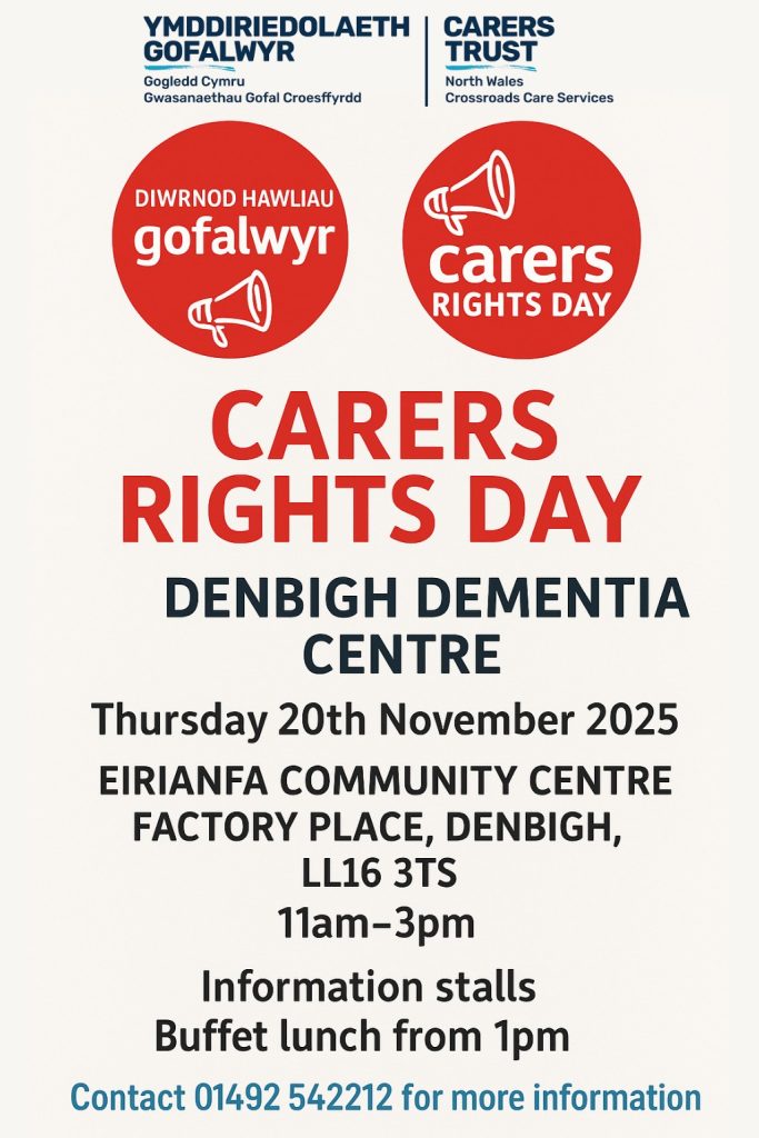 Denbighshire Dementia Centre are hosting an information event to mark Carers Rights Day on Thursday 20th November from 11am to 3pm. There will be a selection of stalls set up in the hall at Canolfan Eirianfa Centre and also be a buffet lunch available from 1pm.