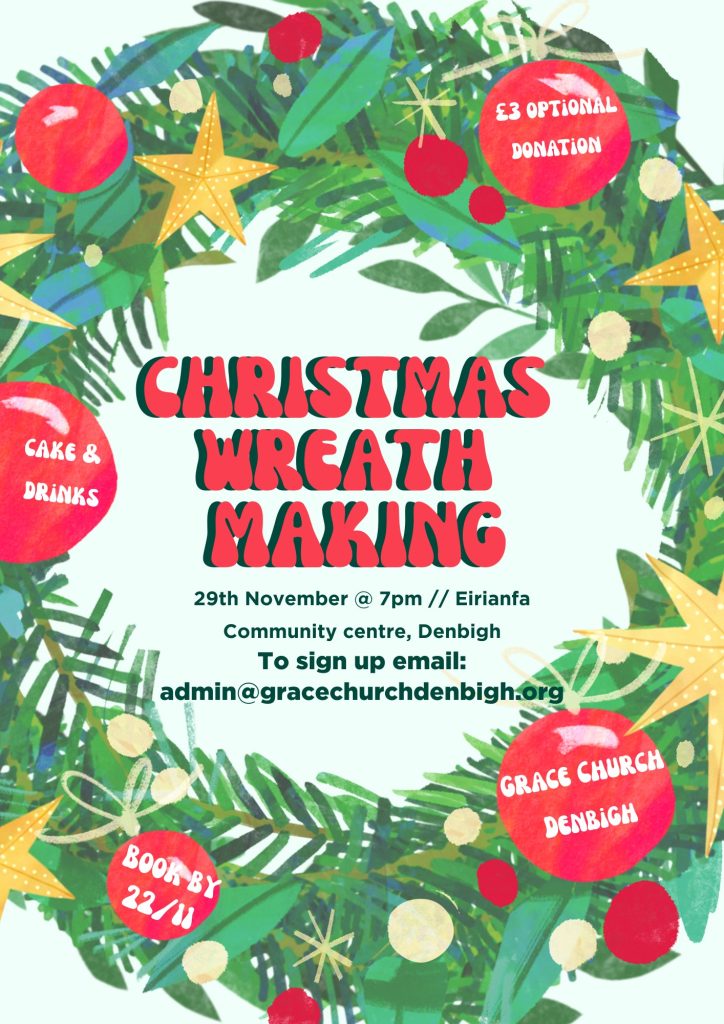 Grace Church Denbigh are hosting a Christmas wreath making session from 7pm on Saturday 29th November. Come along and join the group for this festive crafting event where there will also be drinks and cake.