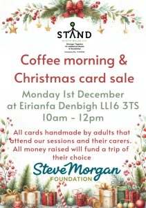Come along to Stand North Wales’ coffee morning and Christmas card sale taking place on Monday 1st December from 10am. All the cards on sale have been handmade by the adults and their carers who attend the Monday social sessions and any funds raised will go towards a trip of their choice.